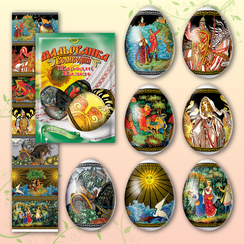 Мальованка "Народні казки" - етикетка для прикрашання традиційних пасхальних яєць, виготовлена із термозбіжної плівки. Такий матеріал значно спрощує декорування яєць та дозволяє зайнятися цим процесом з дітьми. А широкий асортимент малюнків дозволяє зробити великодній кошик яскравим.