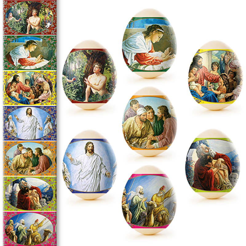 Стрічка "Біблійні" - етикетка для прикрашання великодніх яєць, яка виготовлена з термозбіжної плівки. Виробники попіклувалися про збереження вашого часу, процес прикрашання доволі простий. Мальованки стануть особливою прикрасою великоднього столу, а зображення з біблійними мотивами додадуть святковості.