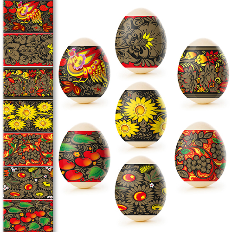 Стрічка "Хохлома" - спеціальна термозбіжна етикетка для прикрашання яєць. Така плівка економить ваш час на прикрашання, широкий асортимент етикеток дозволяє обрати орнамент до душі.
